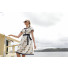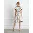 Our Glamour Girl print is an ode to the high living jet set era with oversized, dramatic accessories. Sunshine and tan colours on an oatmeal base with accents of navy. Bindi features: Button through to waist, trimmed with contrast navy frill on a soft square neckline Gathered skirt with side pockets finished with a navy trim frill Contrast tie sash Straight gathered sleeves finished with a contrast frill Model wears: XS (size 8 AUS) Size XS from shoulder to hem is 99cm 100% dress weight cotton Care: Reverse cold, gentle hand wash